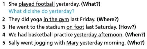 2. They did yoga in the gym last Friday. (Where?) (Họ đã tập yoga ở phòng gym vào thứ sáu trước.)
