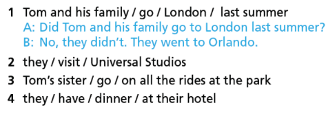 1. Write the verb in the Past Simple in the correct column. 2. Complete the sentences. Use the verbs from the list in the Past Simple 3. Put the verbs in brackets in the Past Simple negative or interrogative. Then complete the answers with did or didn’t. 4. Use the words in brackets to write questions in your notebook as in the example. Read them aloud. 5. Put the verbs in brackets into the Past Simple. Which verbs are regular? Which are irregular? 6. Form complete questions. Then use the blog i