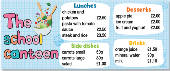 4. Imagine you are in the school canteen. Use the menu to act out a dialogue similar to the one in Exercise 1. Mind your intonation and rhythm.