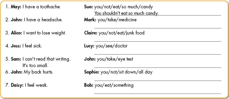 New Words a. Number the pictures. Listen and repeat. b. In pairs: Discuss more health problems and advice and note them down. Listening a. Listen to Jacob visiting the doctor. Circle the reason for Jacob's visit. b. Now, listen and fill in the blanks. c. What do you do when you're sick? Why? Grammar a. Listen and repeat. b. Use the prompts to give advice for each problem. c. Fill in the blanks using should or shouldn't. d. In pairs: Ask for and give your partner advice using the prompts.