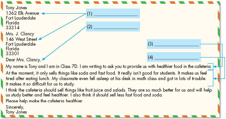 In pairs: What food and drinks can you buy at your school? Which are healthy and which are unhealthy? Listen to an interview with James Olive. Where is the interview taking place? b. Now, listen and circle. a. Read Tony's letter and circle who you think Mrs. Clancy is. b. Now, read and circle the correct answer. c. In pairs: What can you buy in your school cafeteria? a. Read about writing request letters. Then, read Tony's letter again and fill in the labels. b. Number the sentences (1-7). Use t