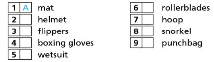 1. Match the word (1- 9) to the letters (A- I). Listen and check 2. Write the sports/ activities (1- 5) under the correct heading 3. Listen and match the people (1- 3) to the sports/ activities (A- D) they are doing now. There is one extra word. 4. Act out dialogues as in the example.