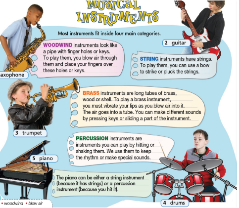 1. Look at the pictures of the musical instruments. Listen and repeat. 2. Which musical instrument can be a string or a percussion instrument? Listen and read to find out. 3. Read the text again. Choose the correct musical instruments from the text to answer the questions.