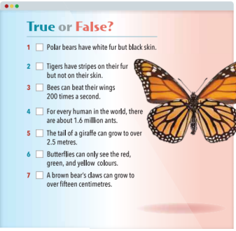 6. Butterflies can only see the red, green, and yellow colours. => True