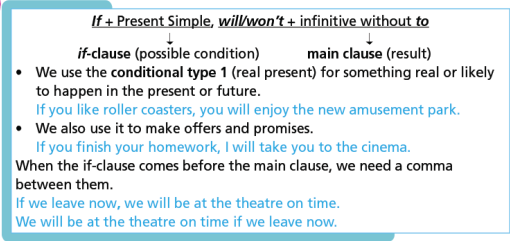 If + Present Simple, will/won’t + infinitive without to