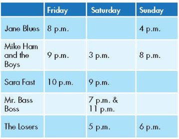 (Có một lễ hội âm nhạc ở thị trấn của bạn vào tuần này. Làm nhóm 3: Hỏi và trả lời về các buổi biểu diễn âm nhạc khác nhau, sau đó chọn 4 nghệ sĩ muốn xem. Hoàn thành ghi chú.)