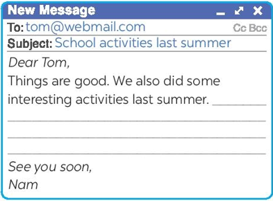 (Giả sử bạn là Nam. Bây giờ, hãy viết một email khoảng 70 từ cho Tom về các hoạt động ở trường của bạn vào mùa hè năm ngoái. Mở đầu email của bạn như hình dưới đây.)