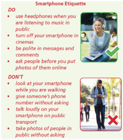 3. Collect more information about smartphone etiquette. Prepare and give the class a presentation. Think about: