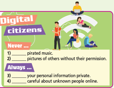 1. Read the sentences about smartphone etiquette. Which sentences are true for you and which are not? 2. Use the ideas in Exercise 1 to create a leaflet about the Dos and Don’ts of using smartphones. Use photos of drawings. 3. Collect more information about smartphone etiquette. Prepare and give the class a presentation. Think about: 4. Use the verbs to complete the sentences. 5. Are you a good digital citizen? Give examples.