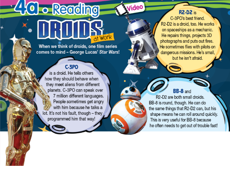 1. Listen to the music and look at the pictures. What images come to mind? 2. Read through the text. What different types of droids are there? Listen and read to find out. 3. Read the text again. For questions (1- 3), choose the correct answer (A, B or C). 4. Which droid seems to be the most interesting to you? 5. Choose the correct preposition. 6. Listen and repeat. 7. Match the sentences (1-6) to the jobs (A- F) in Exercise 6, then make sentences as in example. 8. Which of the jobs in Exerci