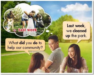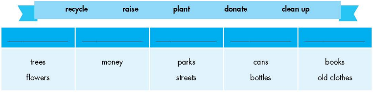 a. Fill in the table. Listen and repeat. b. In pairs: Add more words to the table. Share your ideas with the class. a. Listen to two people talking. What is the purpose of the interview? b. Now, listen and circle. c. In pairs: What kinds of things could you do to help your local community? a. Listen and repeat. b. Fill in the blanks with the Past Simple form of the verbs in brackets. c. Look at the table and write the sentences. d. In pairs: Ask and answer using the information in Task c. a. Fo