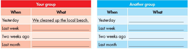 a. Your school went out to help the community. Fill in the table with details about what you did. Then, ask your partner about what they did and complete the table on the right. Swap roles and repeat.