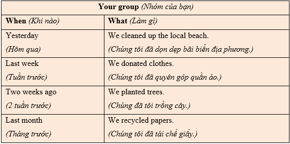 (Trường bạn đi giúp đỡ cộng đồng. Điền vào bảng với những điều chi tiết bạn đã làm. Sau đó hỏi bạn đồng hành về những gì họ đã làm và hoàn thành vào bảng ở bên phải. Hoán đổi vai trò và lặp lại.)