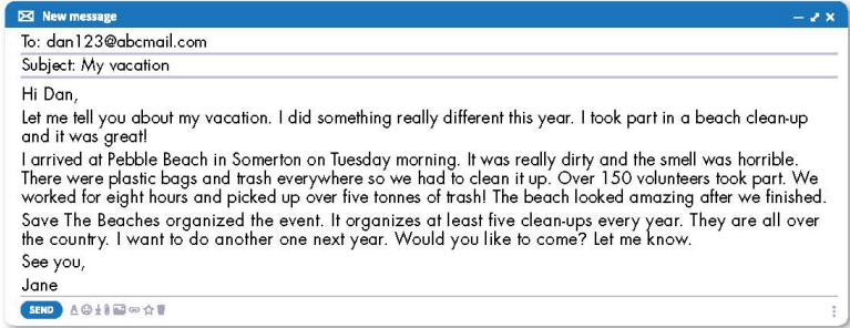 In pairs: Look at the picture. Do you know any beaches that look like this? How does it make you feel? What can we do to stop this from happening? a. Listen to Annie talking to Robert. What do you think Annie's job is? b. Now, listen and circle. a. Read Jane's email to Dan. Would Jane like to take part in future clean-ups? b. Now, read and write True or False. c. In pairs: Would you like to take part in a beach clean-up? Why (not)? a. Read about writing emails to describe past experiences. Then,