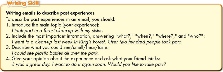 a. Read about writing emails to describe past experiences. Then, read Jane's email again and circle the information, answering "what?", "when?", "where?" and "who?"