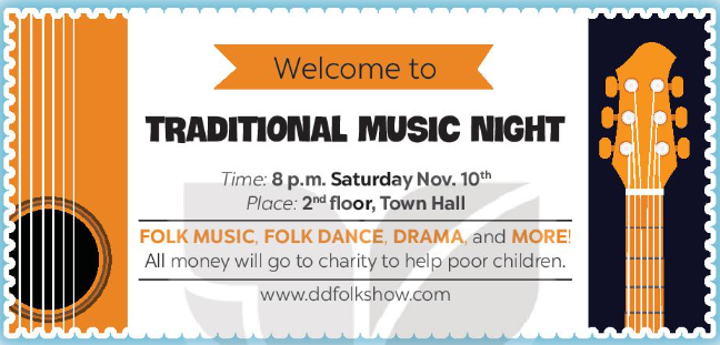 The event is Traditional Music Night. It will take place at 8 p.m on Saturday, November 10th and on the 2nd floor of Town Hall. At the event you can enjoy folk music, folk dance, drama, and more. All the money from the event will be go to charity to help poor children.