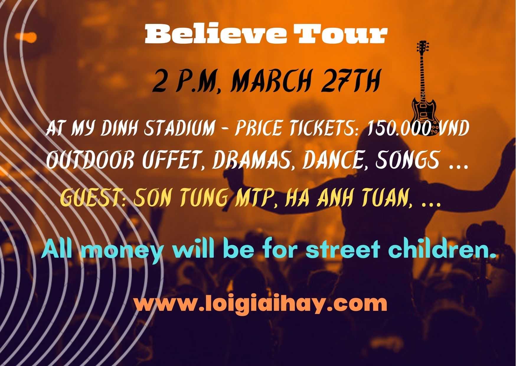 The event is Believe Tour. It will take place at 2 p.m on March 27th at My Dinh Stadium. The special guests - Ha Anh Tuan, Son Tung MTP,… - will also participate this event. The ticket price will be 150,000 VND. At the event you can enjoy outdoor buffet, watch dramas, dance, sing songs …, and more. All the money from the event will be go to charity to help street children.
