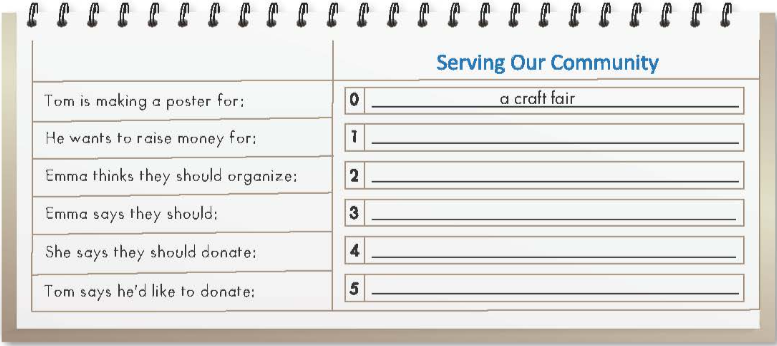 You will hear a boy talking to his friend about different kinds of community service. Listen and complete questions 1-5. You will hear the conversation twice.Look and read. Choose the correct answer (A, B, or C). Fill in the blanks with the words from the box.a. Fill in the blanks with the Past Simple form of the verbs in brackets.b. Underline the mistake in each sentence. Write the correct word on the line. a. Circle the word that has the underlined part pronounced differently from the others.b