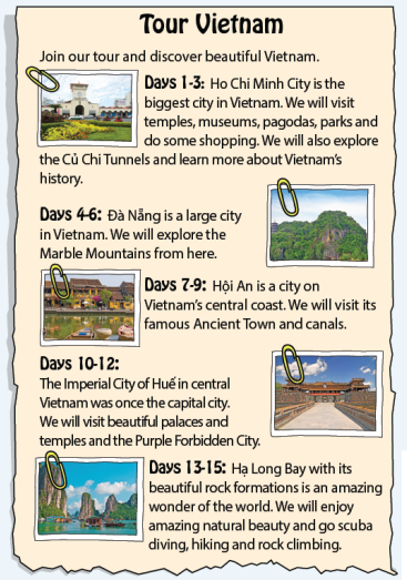 Ngày 1- 3: Thành phố Hồ Chí Minh là một thành phố lớn ở Việt Nam. Chúng ta sẽ thăm các đền, bảo tàng, chùa, công viên và đi mua sắm. Chúng ta cũng sẽ khám phá địa đạo Củ Chi và tìm hiểu thêm về lịch sử của Việt Nam.