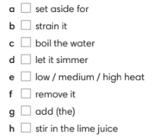 1. Are there any foreign foods you like to eat? What are they? What do they taste like? 2. Listen and write the amount of each ingredient you hear. 3. Listen to how to cook the dish. Choose the correct answer. 4. Listen again. Number the words in the order you hear them. 5. In pairs, describe how to cook a dish.