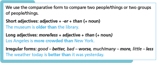 1. Choose the correct option. 2. Look at the table and compare the places. 3. Use the headings in the table in Exercise 2 to compare the place you live with another one in Vietnam. 4. Write the superlative forms. 5. Choose the correct option. 6. Put the adjectives in brackets into the correct comparative or superlative form. Add any necessary words. 7. Talk about places in your city/town. Use the comparative or superlative forms.