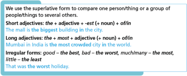 Irregular forms: good- the best, bad- the worst, much/many- the most, little- the least.