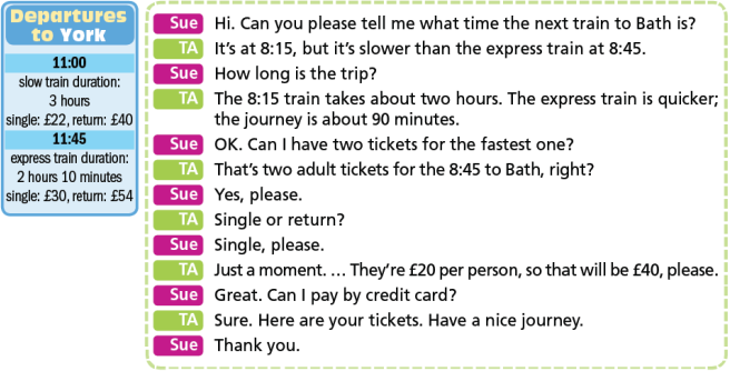 1. a) The sentences below are from a dialogue between a ticket agent (TA) and a customer (C). Who says each sentence? b) Listen, read and check. (Nghe, đọc và kiểm tra.) 2. Read the dialogue again. Where is Sue going? How much are the tickets? Is the dialogue formal or informal? 3. Take roles and read the dialogue aloud. Mind your intonation and rhythm. 4. Act out a similar dialogue. Use the dialogue in Exercise 2 as a model and the information in the table Departures to York. Mind your intonati