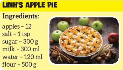 3. Work in pair. Ask and answer about the ingredients for Linh's apple pie, using the quantities in the recipe.