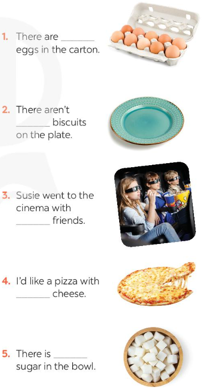 | 1. some | 2. any | 3. some | 4. a lot of | 5. a lot of |