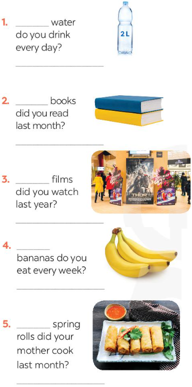 (Điền vào chỗ trống với How many hoặc How much. Sử dụng bức tranh tra lời câu hỏi.)