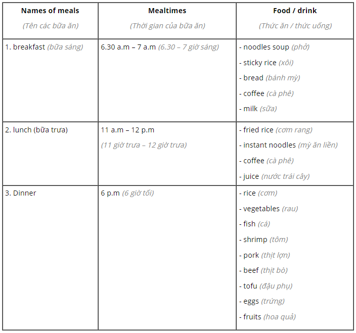 - names of main meals and mealtimes (tên các bữa ăn chính và giờ ăn)
