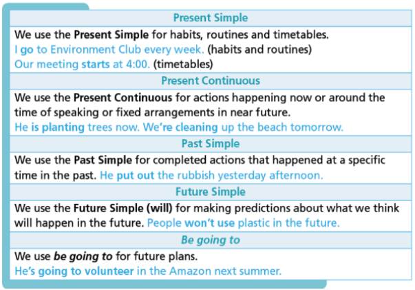 We use the Present Simple for habits, routines and timetables. (Chúng ta sử dụng thì hiện tại đơn cho thói quen, lịch trình và thời gian biểu.) I go to Environment Club every week. (habits and routines) (Tôi đến câu lạc bộ Môi trường mỗi tuần (thói quen và lịch trình).) Our meeting starts at 4:00. (timetables) (Buổi gặp mặt của chúng tôi bắt đầu sau 4:00 (thời gian biểu).) |