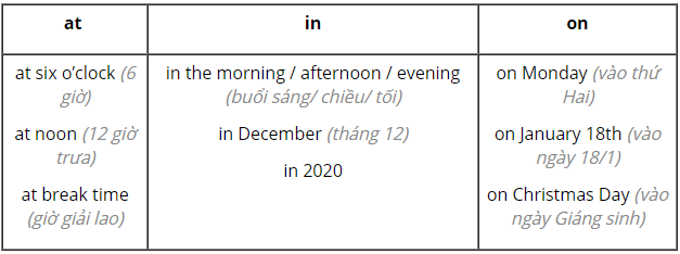 + các buổi trong ngày (at noon, at night, at weekend)