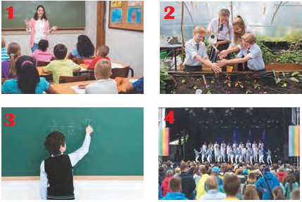 1. Complete the sentences, using suitable prepositions of time. 2. Work in pairs. Ask and answer the questions about your school. 3. Complete the sentences with at, in, or on. 4. Work in pairs. Look at the pictures and answer the questions. 5. Complete the passage with at, on, or in. Then discuss in groups which prepositions express time and which ones express place