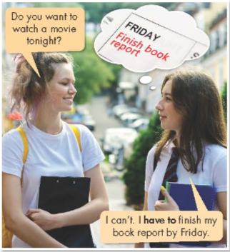 b. In pairs: Say which things you have to do at school.a. Listen to two students trying to make plans. Who is busier?b. Now, listen and fill in the blanks.c. In pairs: Does your life sound more like Alan's or Lucy's? Why?a. Listen and repeat.