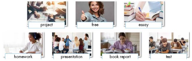 _1_ a. a piece of writing to answer a question or to explain your ideas ____ b. a piece of writing about a story or novel ____c. a short talk about a topic ____d. a paper with many questions to check someone's knowledge in a subject ____e. This is a large piece of work. It can have photos, arts and crafts, posters, and videos as well as writing. ____f. Teachers give students this work to do after school. |