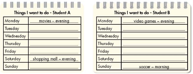 a. Make plans with your classmate. In pairs: Student B, 119 File 4. Student A: Write the activities you want to do and invite Student B to join you. Swap roles and repeat. Student A, 120 File 5.
