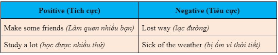 (Bây giờ, nói về hai trải nghiệm tích cực và hai trải nghiệm tiêu cực khi bạn du học. Sau đó điền vào bảng.)