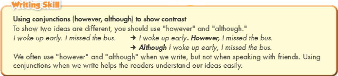 Chúng ta thường sử dụng "however" và "although" khi chúng ta viết, nhưng không dùng khi nói với bạn. Việc sử dụng liên từ khi chúng ta viết giúp người đọc dễ dàng hiểu được ý tưởng của chúng ta.