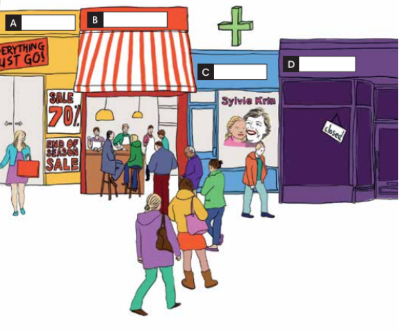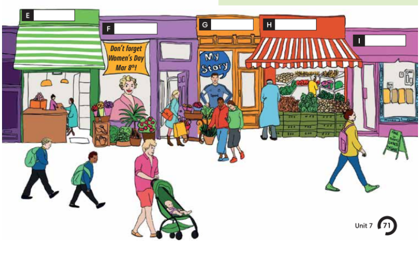 3. In pairs, use the words in the Vocabulary box to label the shops A-I in the picture. Use the clues below.