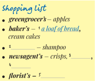 1. In pairs, ask and answer the questions. 2. ( I KNOW ) How do you say the words below in your language? Can you add more words? 3. In pairs, use the words in the Vocabulary box to label the shops A-I in the picture. Use the clues below. 4. WORD FRIENDS Match the shops on the left with the items on the right. 5 Listen and complete Jas’s shopping list. What did she forget to buy? 6. Work in pairs. Ask and answer about your favourite shop. Use the following question:
