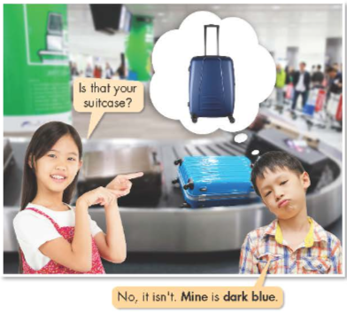 a. Number the pictures. Listen and repeat. b. In pairs: Discuss adjectives you could use for these items: suitcase, backpack, and luggage.a. Listen to Jenny and Fred at the airport. What are they doing?b. Now, listen and fill in the blanks.c. In pairs: What type of luggage do you like to travel with? Why? a. Listen and repeat.b. Fill in the blanks with the correct order of adjectives. c. Fill in the blanks with the correct possessive pronouns to complete the conversation. d. In pairs: Ask your