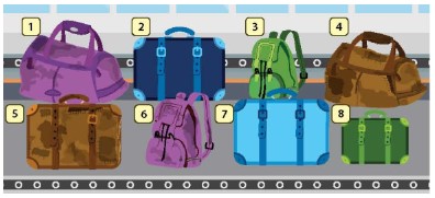 (Bạn đang ở khu lấy hành lý để lấy hành lý cho bạn mình. Theo cặp: học sinh B, file 6 trang 120. Học sinh A, hỏi hành lý của bạn mình là cái nào. Chỉ và đoán, sau đó điền số vào hộp.)
