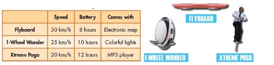- The Flyboard has electronic map, 1-Wheel Wonder has colorful lights, the Xtreme Pogo has MP3 player.