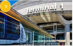 Jane: Look at that yellow sign. We must catch the shuttle to Terminal 1, then walk to Gate 34.