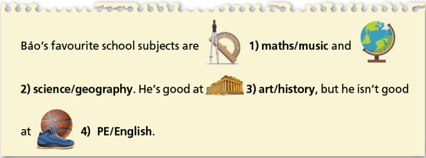 Bảo’s favourite school subjects are 1) maths and 2) geography. He’s good at 3) history, but he isn’t good at 4) PE.