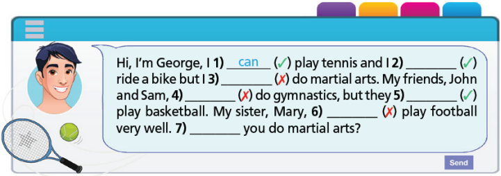 1. Look at the pictures, read the texts and write the nationalities. 2. Choose a person in Exercise 1 and present him/ her to your partner. 3. Write the numbers in words in your notebook. 4. Which floor are these people on? Write the numbers in words. 5. Complete the questions, then answer them. 6. Choose the correct option. 7. Fill in each gap with can or can't. 8. Tell your partner about what you can do and what you can't do.