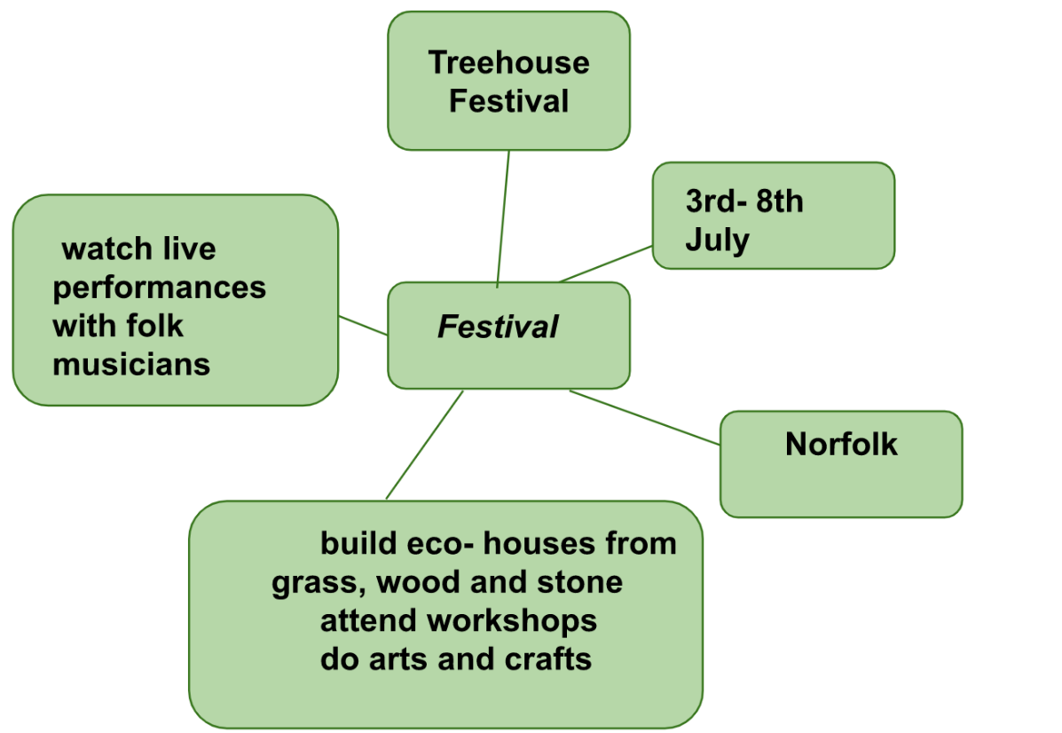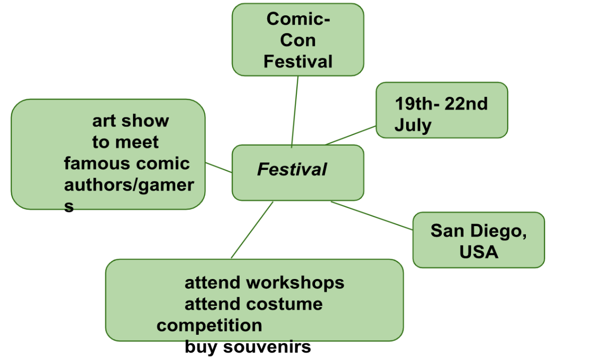 5. Brainstorming: Copy the spidergram in Exercise 2 into your notebook and then complete it with information about a festival you are going to attend.