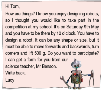 Mọi thứ thế nào? Tớ biết bạn thích thiết kế robot, vì vậy tớ nghĩ bạn muốn tham gia cuộc thi ở trường tớ. Cuộc thi diễn ra vào Thứ Bảy, ngày 9 tháng Năm và bạn phải có mặt ở đó trước 10 giờ. Bạn phải thiết kế một robot. Nó có thể có bất kỳ hình dạng hoặc kích thước nào, nhưng nó phải có khả năng di chuyển tới và lui, xoay trở và nâng 500 g. Bạn có muốn tham gia không? Tớ có thể nhận lấy đơn đăng ký cho bạn từ giáo viên khoa học, thầy Benson.