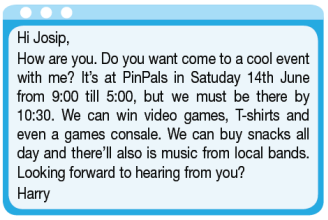 Bạn có khỏe không. Bạn có muốn đến một sự kiện thú vị với tôi không? Nó diễn ra tại PinPals vào Thứ Bảy ngày 14 tháng 6 từ 9:00 đến 5:00, nhưng chúng tôi phải có mặt ở đó trước 10:30. Chúng ta có thể giành chiến thắng trò chơi điện tử, áo phông và thậm chí là máy điều khiển. Chúng ta có thể mua đồ ăn nhẹ cả ngày và sẽ có nhạc của các ban nhạc địa phương. Mong thư của bạn.